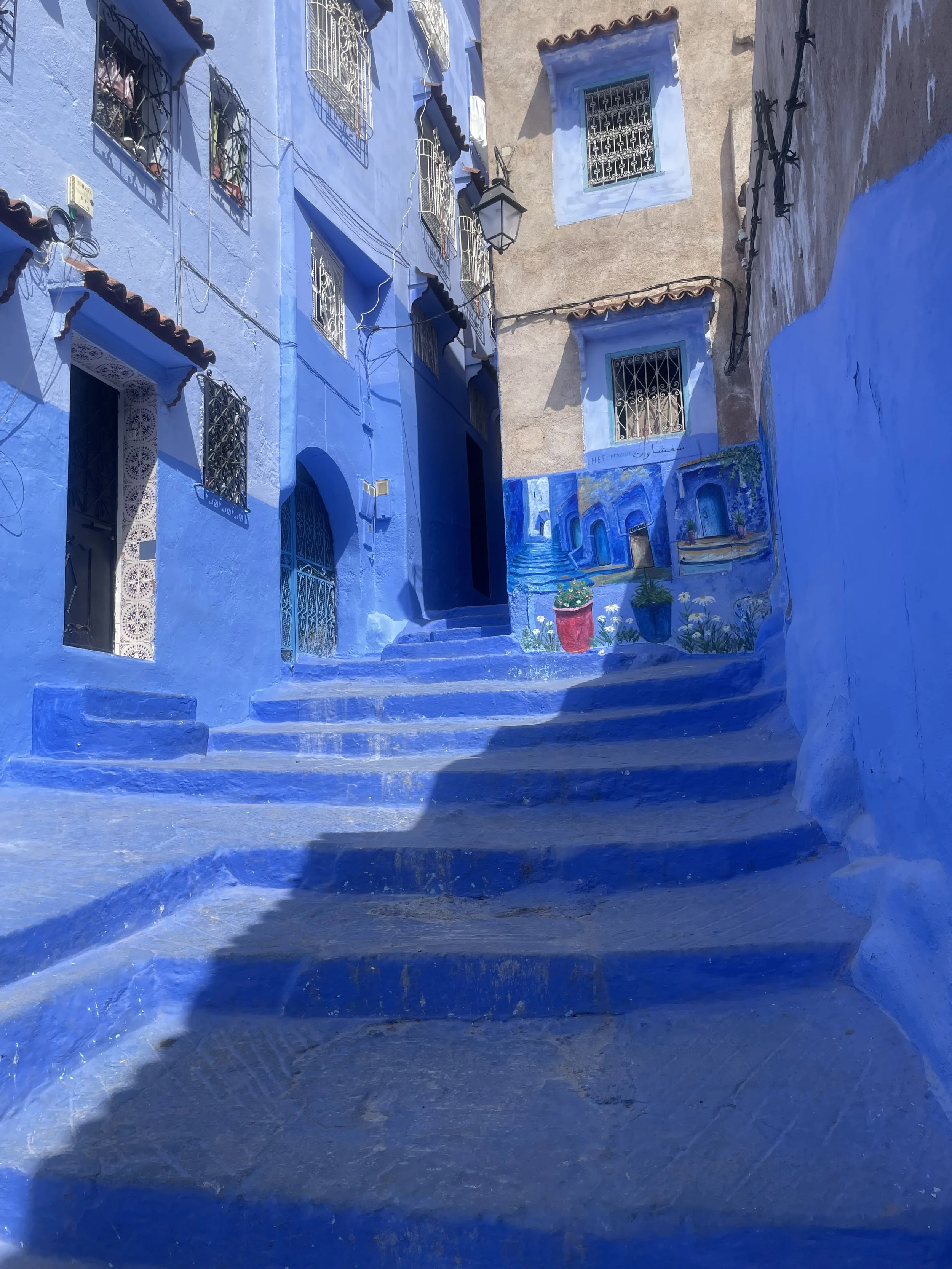 In Chefchaouen, enjoy the peaceful blue-washed streets, local cafés, and stunning mountain views.